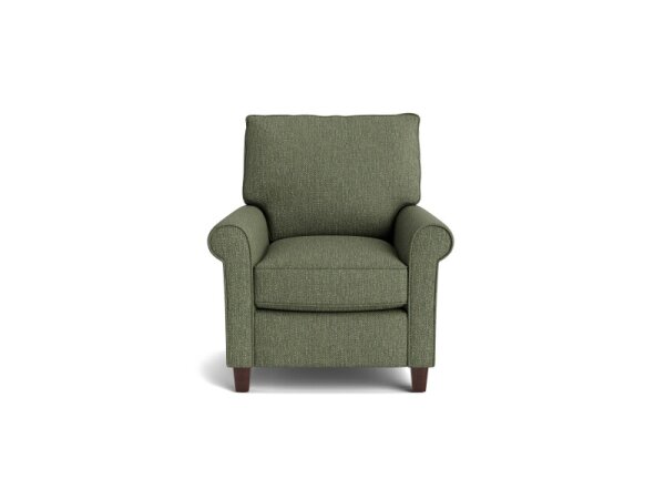 Transitional fabric accent chair with sock arms and box-border cushions over sinuous-wire construction for balanced comfort. Removable wooden legs simplify placement and setup.