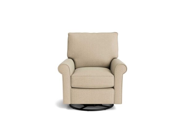 Transitional swivel glider chair with sock arms and box-border cushions over sinuous wire support for comfort and durability. 35 in. W x 38.5 in. D x 39.5 in. H.