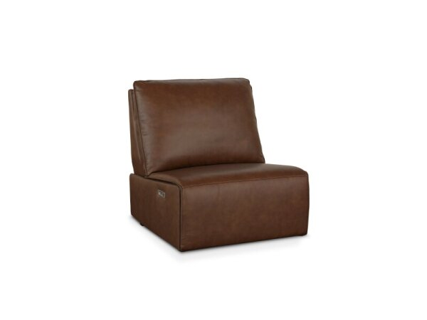 Armless zero gravity power recliner in leather with slipper-chair lines and an adjustable headrest; reclines deeply while requiring only 8 in. of clearance.