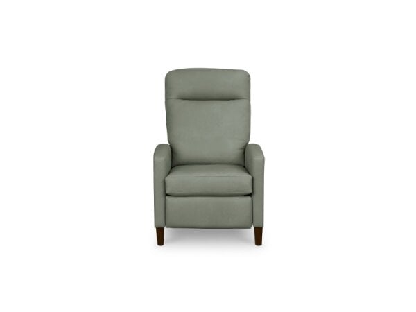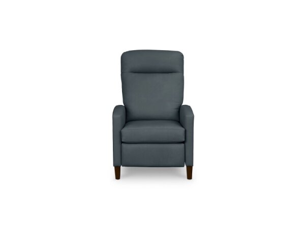 Leather track-arm recliner with lay-flat, manual push-back comfort, channeled headrest and tapered wood legs for a modern living room. Optional power mechanism available.