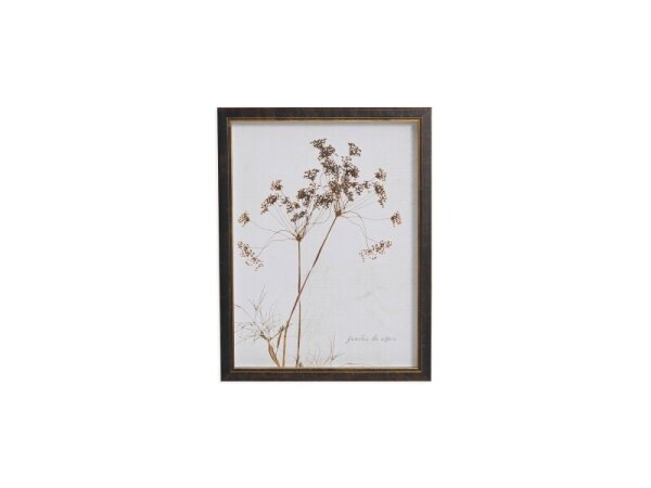 Sepia-toned botanical print of Queen Anne's lace with an antiqued background, framed in black and gold and ready to hang. Designed, printed, and assembled in the USA.