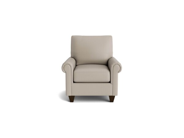 Accent chair with gently rolled arms and a clean silhouette, customizable in designer fabrics and cushion comfort. Measures 39 in. H x 35 in. W x 38 in. D.