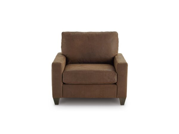 Leather chair-and-a-half with wide track arms and a deep, spacious seat for relaxed lounging. Customize the cushion comfort to suit your lounging style.