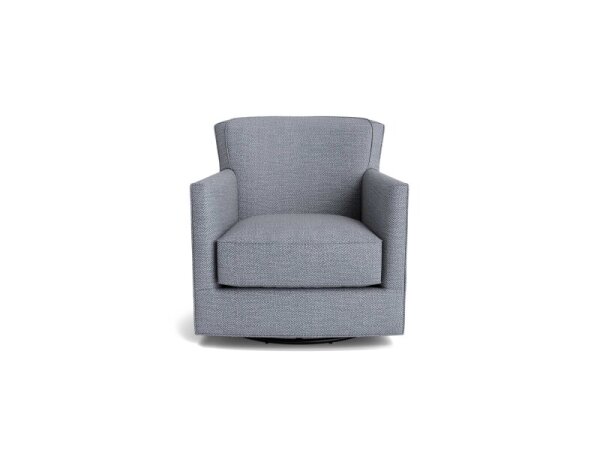 Fabric swivel accent chair with thin track arms, a plush box seat, and padded back for everyday comfort; 35.5 in. H x 30 in. W x 33 in. D.