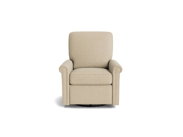 Transitional swivel glider chair with rolled panel arms, a semi-attached back, and a loose seat cushion for easy comfort. Fabric upholstery with neat welt seams blends with any décor.