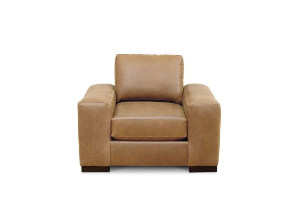 Low-profile leather chair with wide track arms and deep seating for relaxed lounging. Loose, removable back cushions and thick padding add lasting comfort.