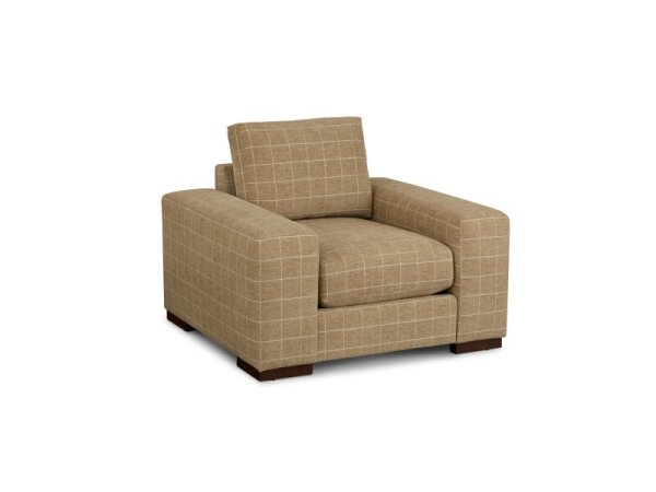 Wide track-arm accent chair with deep seating and loose cushions that allow rotation. Removable back cushions and 2 in. block legs in a Brindle finish.