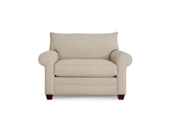 Spacious chair-and-a-half accent chair with a semi-attached bed pillow back and boxed seat cushion. Tapered legs in warm walnut; 41 in. W x 37 in. D x 39 in. H.