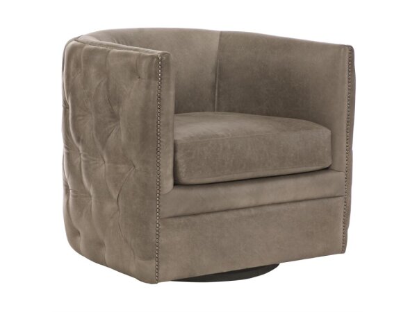 A modern interpretation of the classic barrel chair, this tufted leather swivel chair offers an abundance of comfort and style.