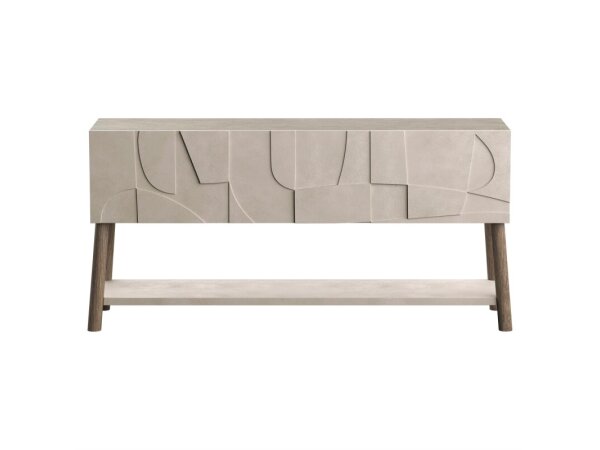 A primitive drum shape is redefined with deeply carved arches in this side table.