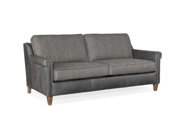 Leather stationary sofa with eight-way hand-tied support and Spring Down cushions for long-lasting comfort. Loose back cushions and tapered legs complete its transitional look.