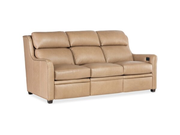 Transitional leather stationary sofa with sinuous spring seating and Spring Down cushions for supportive comfort. Tight bustle back and nailhead trim pair with a standard Mahogany finish.