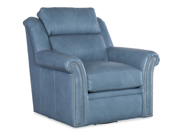 Leather stationary arm chair with eight-way hand-tied coil support and a Spring Down seat for resilient comfort. Loose back cushion and nailhead trim complement its transitional style.