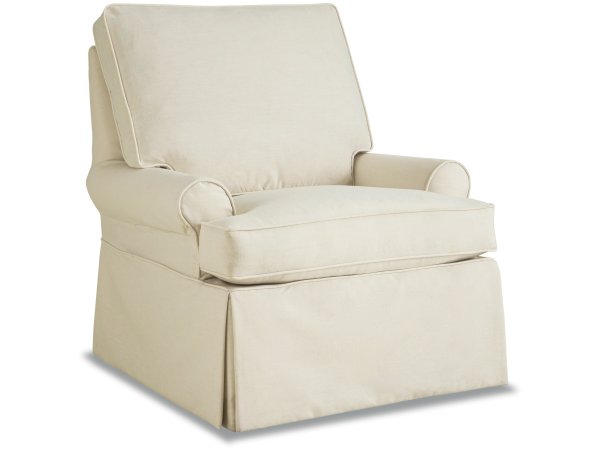Relax in laid-back luxury with this beautiful slipcovered swivel glider. Featuring a high back for added support, soft sock arms,