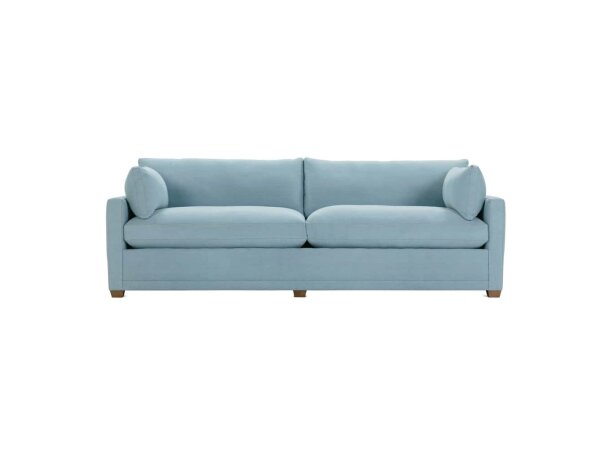 The Sylvie Everyday Denim Sofa is designed with two back pillows, two seat cushions, and Cloud Down standard cushions for a comfortable seating experience. Deep seating and supportive arms add to its appeal.