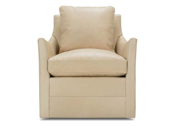The Ingrid Leather Swivel Chair with glider option offers a single back pillow, one cushion, and a Cloud Down standard cushion for comfort. Leather and swivel/glider features are indicated by the name.