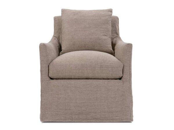 The Ingrid slipcovered swivel chair with glider option offers a Cloud Down cushion and a single back pillow for comfortable, flexible seating. Designed for both style and support in any room.
