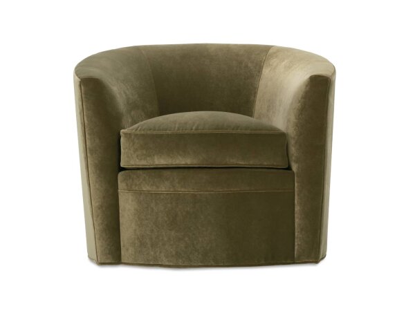 The Baldwin Swivel Chair features a classic cushion and a single seat design, offering comfortable support in a compact accent chair. Ideal for living rooms or reading nooks with its smooth swivel function.