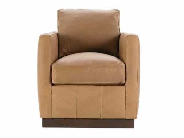 The Alba Leather Swivel chair features a Cloud Down cushion and a single back pillow for comfort, with a smooth swivel base. Its compact design and leather upholstery make it a versatile accent chair for living spaces.