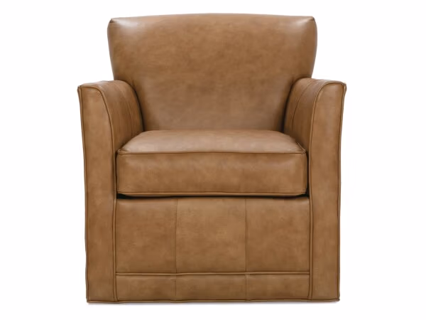 The Times Square Leather Swivel Chair features a classic cushion, tight back, and leather upholstery for a modern, supportive seat. Its swivel base adds versatility to living areas.