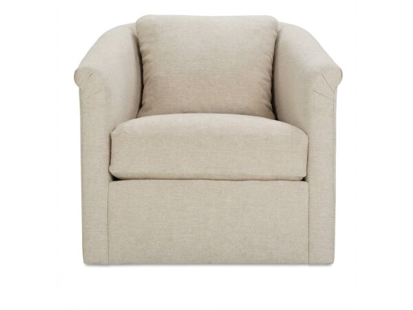 The Wrenn Swivel Chair features a single back pillow and cushion with a Cloud Down fill for comfort. Its swivel base and supportive arm height make it a versatile accent chair for living spaces.