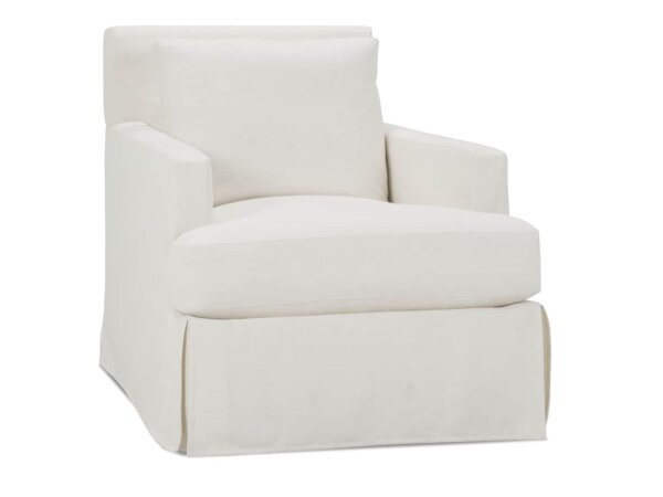 The Laney Slipcovered Swivel Chair with Glider Option features a Cloud Down cushion and a single back pillow for comfort. Its slipcovered design and glider function add versatility to living spaces.