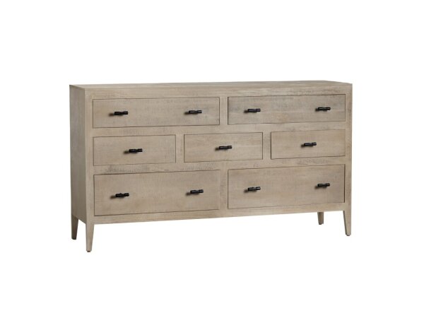 Five-drawer chest in a light Surf whitewashed finish over oak veneers with light champagne ring pulls. Top drawer has a removable felt liner and the bottom drawer is cedar-lined.