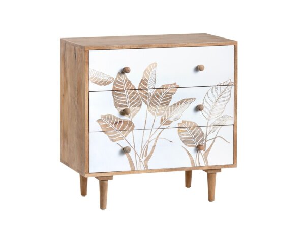 Three-drawer chest pairs a Pecky Hickory veneer top in Vintage Natural with a burlap-wrapped case and patterned nailhead detail. Self-closing drawers include a removable felt-lined top and cedar-lined bottom.
