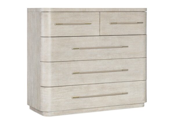Bachelor's chest in Diamond-finished Oak veneers with rounded corners and a plinth base. Five self-closing drawers include felt-lined top drawers and a cedar-lined bottom for protected storage.