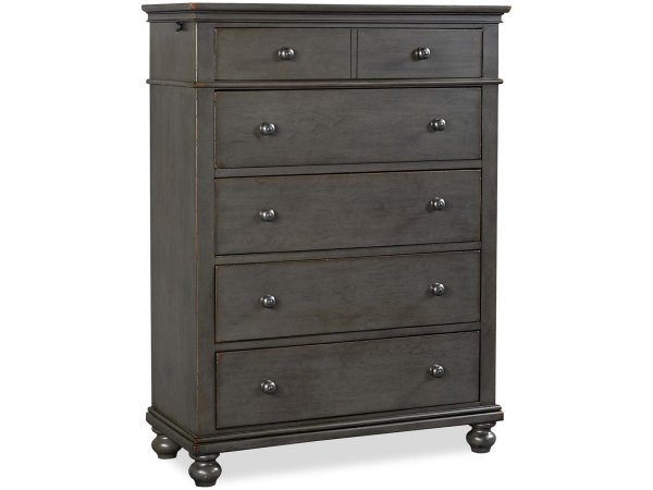 This 6-drawer chest is crafted from Rubberwood solids and Hickory veneers with a Chateau Brown finish. It features felt-lined top drawers for jewelry, a cedar-lined bottom drawer, and soft-closing drawer guides for smooth operation.