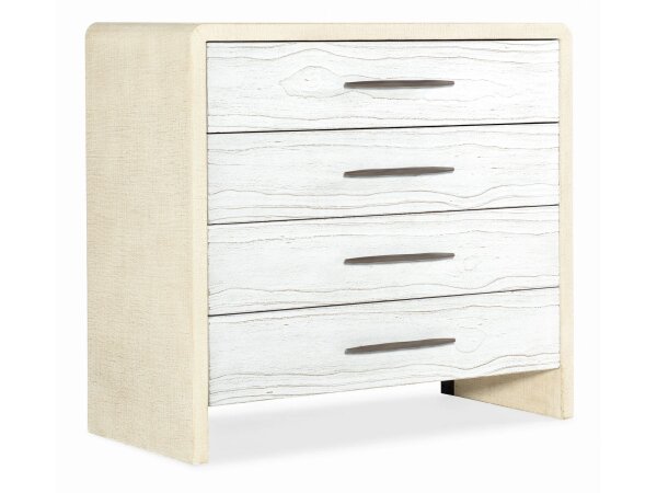 Elegant lingerie chest featuring a European Traditional design with a weathered brown whitewash top and antique white finish. It includes fully stained, felt-lined top drawers, cedar-lined bottom drawers, and French & English dovetail construction for dur