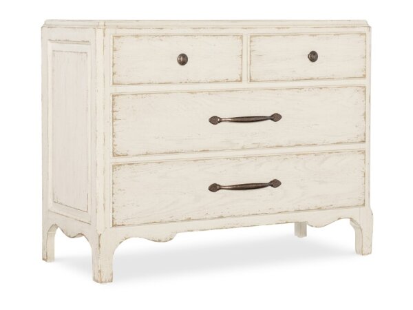 This Abbey Park 5-drawer chest offers European traditional design with an antique white and weathered brown finish on rubberwood solids. It features durable full extension metal glides and felt-lined top drawers for organized storage.