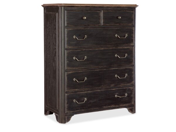 This elegant 6-drawer chest is crafted from poplar solids, birch veneers, and metal with a brownstone finish. It features bottom case dust proofing, fully stained interior drawers, a felt-lined top drawer, and burnished brass hardware.