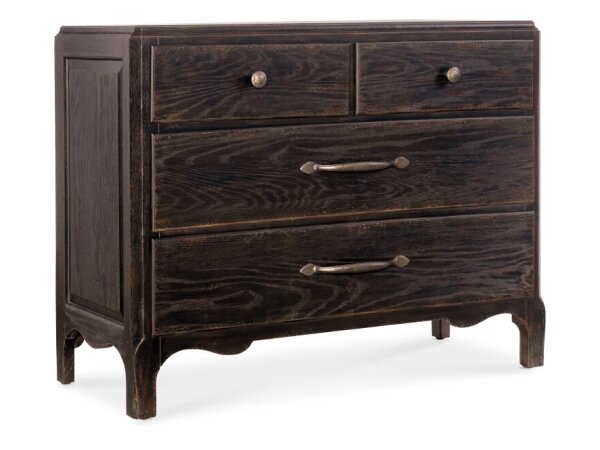 This luxurious 5-drawer chest is crafted from rubberwood solids and hickory veneers with a Chestnut finish. It features carved details, full extension drawers with felt and cedar lining, and antique brass hardware.