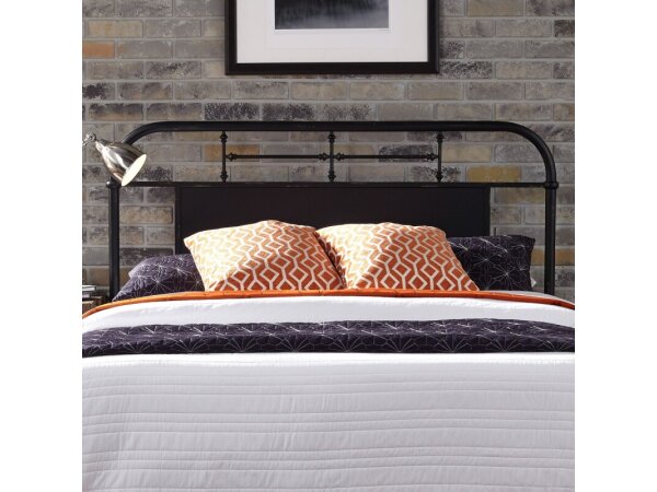 This Queen metal headboard is crafted from metal tube with a black distressed finish, featuring a shaped cap rail and turned spindles. It works with a metal bed frame, ideal for cottage to farmhouse decor.