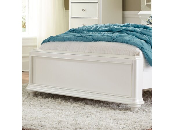 The Stardust Full Panel Footboard features a recessed panel accented with bead molding and bun feet. It is designed to be paired with a headboard and rails for a complete bed.
