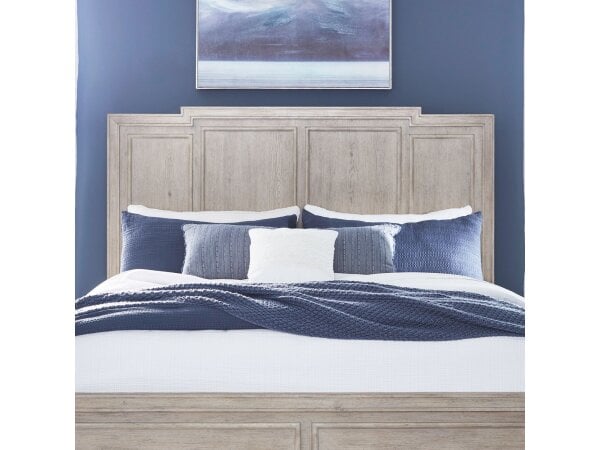 This king upholstered panel headboard features elegant flax tone upholstery and a softly scooped top for subtle shaping. The design is accented by pilasters with double bead molding for a refined look.