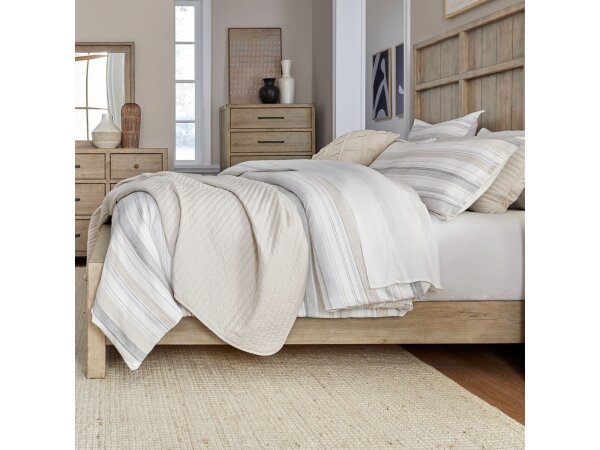 This king panel headboard offers a timeless look with picture frame molding and score lines creating a planked effect. The design is finished with soft chamfered edges.