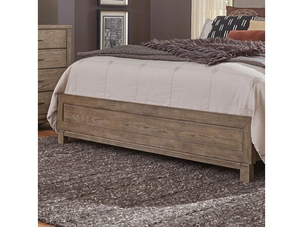 This King panel footboard features heavy picture frame molding, block legs, and a burnished beige finish, crafted from rubberwood solids with reverse split heart oak veneers. It cannot stand alone and must be paired with a headboard and rails.