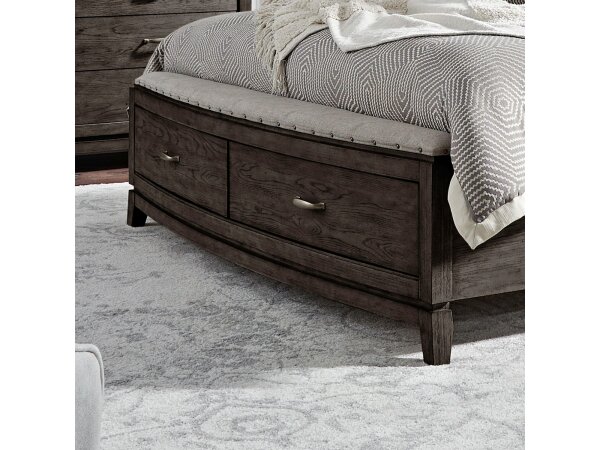 This king storage footboard offers a padded, bench-style seat in oatmeal linen upholstery with nail head trim. It provides cedar-lined drawers for storage and includes a slatroll.