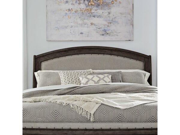 This king upholstered headboard features a wood-framed panel with oatmeal linen upholstery and nail head trim. It has a softly arched cap rail for a stylish, low-profile look.