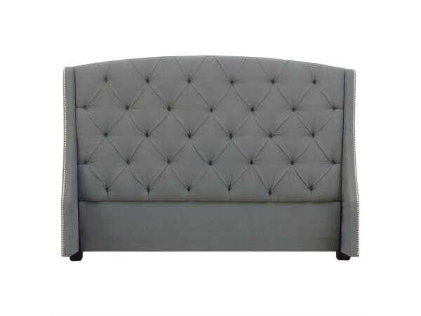 This River Place King Mansion Headboard is crafted from pine solids and veneers with a heavily distressed Riverstone White finish. It features heavy crown molding, high-low veneer panels, and wide pilasters for a classic farmhouse aesthetic.