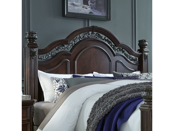 This Queen poster headboard is crafted from poplar and rubberwood solids with birch veneers in a Cognac finish. It features large square posts with acanthus leaf carvings and scrolled metal accents.