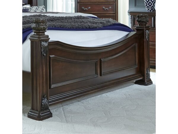 This King poster footboard, in a Cognac finish, features a large square post with acanthus leaf carving, a sloped top rail, and bead molding. It is crafted from poplar and rubberwood solids with birch veneers.