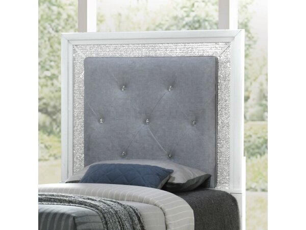 This twin upholstered panel headboard is crafted from Rubberwood solids in a Pearl White finish. It features a button-tufted Gray Chenille panel, touch-activated LED lighting, and sparkling rhinestone accents.
