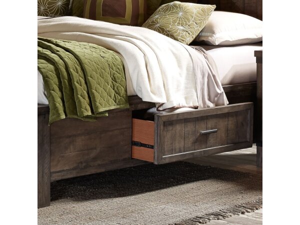 This one-sided storage bed rail is crafted from rubberwood solids and mango veneers with a rock beaten brown finish. It features full extension metal glides, French and English dovetail construction, felt-lined top drawers, and a bolt-on system.