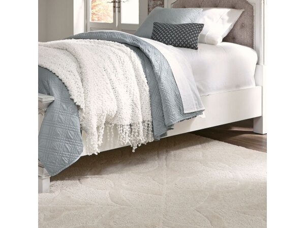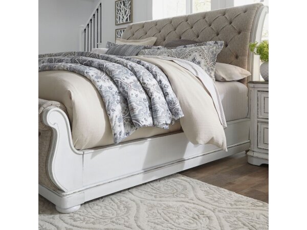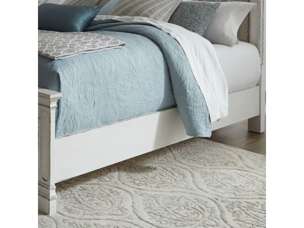 These Magnolia Manor panel bed rails, designed for Twin or Full beds, feature an antique white finish with heavy chipping. They are crafted from rubberwood solids with oak and birch veneers, offering a bolt-on rail system and center support slats with 5.5