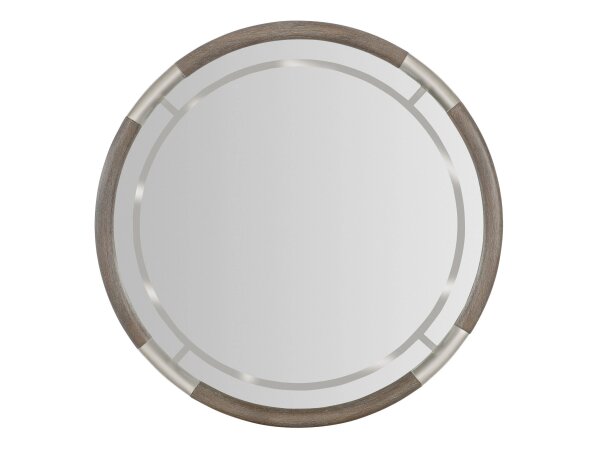Round wall mirror with a compass-like profile, combining Quartered Oak veneers in the Mink finish with a wire-brushed texture and warm pewter metal accents.