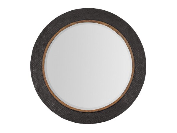 Round accent mirror framed in charcoal Furrowed Bark with a crosshatch texture and Vintage Natural trim. Wood-and-resin construction offers a tactile, organic look.