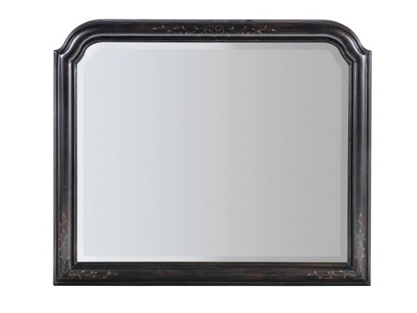 This cottage-style crown mirror features beveled edges and a two-toned wire-brushed white finish with a charcoal top, crafted from poplar and rubberwood solids. It offers bolt-on support and a wide landscape view.